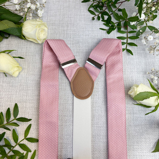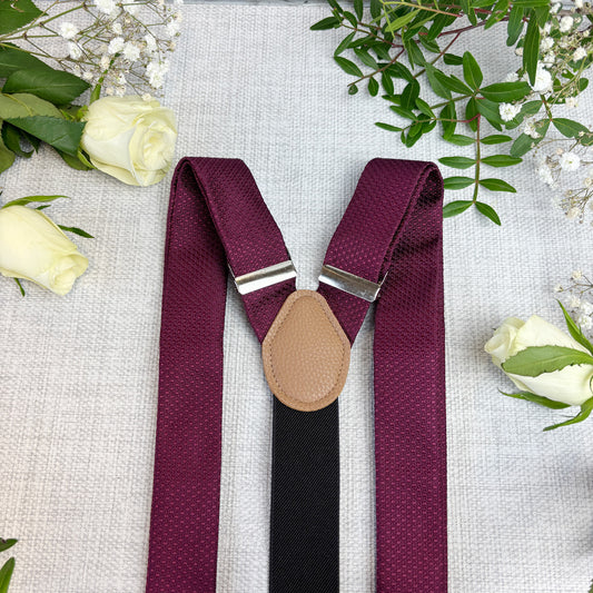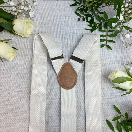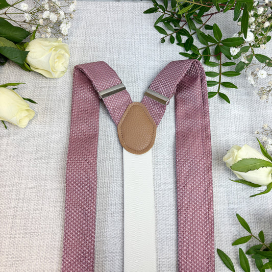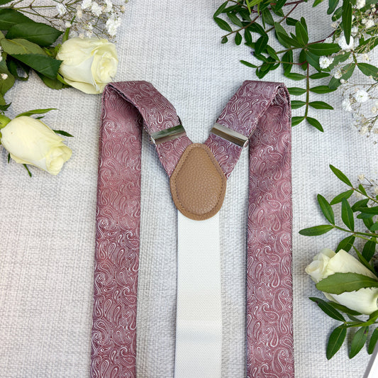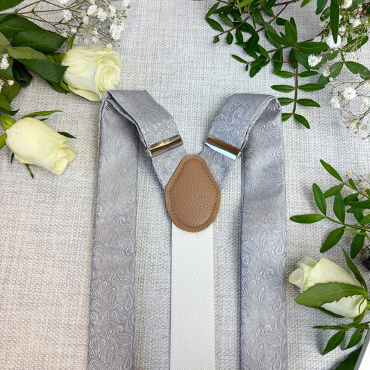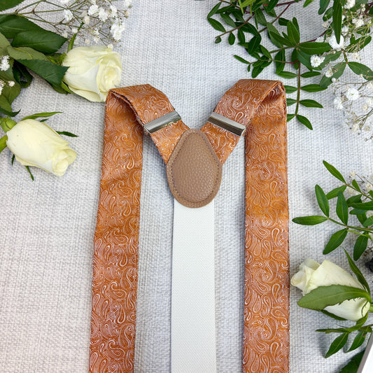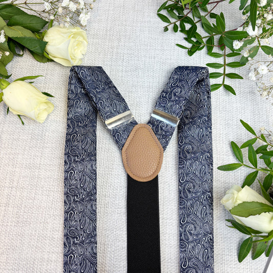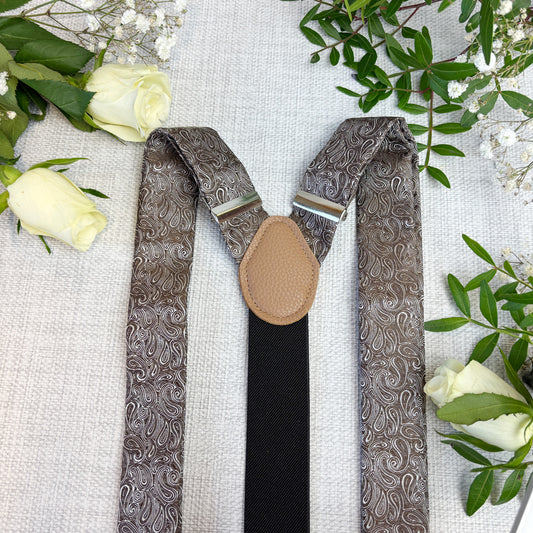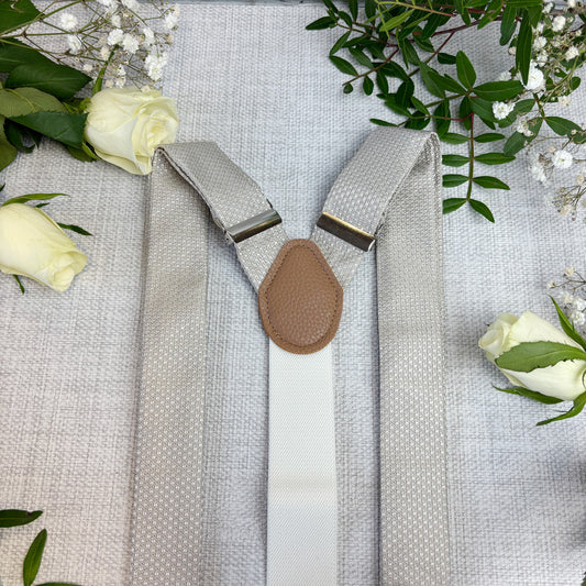Shop the wedding braces collection, premium convertible formal braces designed for weddings, groomsmen attire, and events. These braces feature an elegant fabric panel and versatile fittings, allowing you to wear them with clips or traditional leather ends for brace-button trousers.
