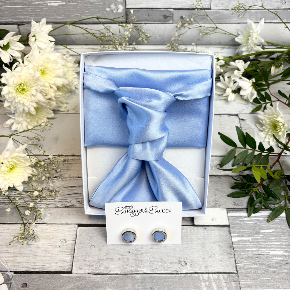 The Baby Blue swatch from Swagger & Swoon, will start you on your colour matching journey. Perfectly match your groomsmen's ties to the bridesmaids' dresses!