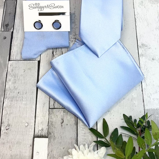 If you're looking for a perfectly curated gift set then look no further! This stunning white presentation box combines a Blue Daisy coloured wedding tie, matching pocket square and socks!