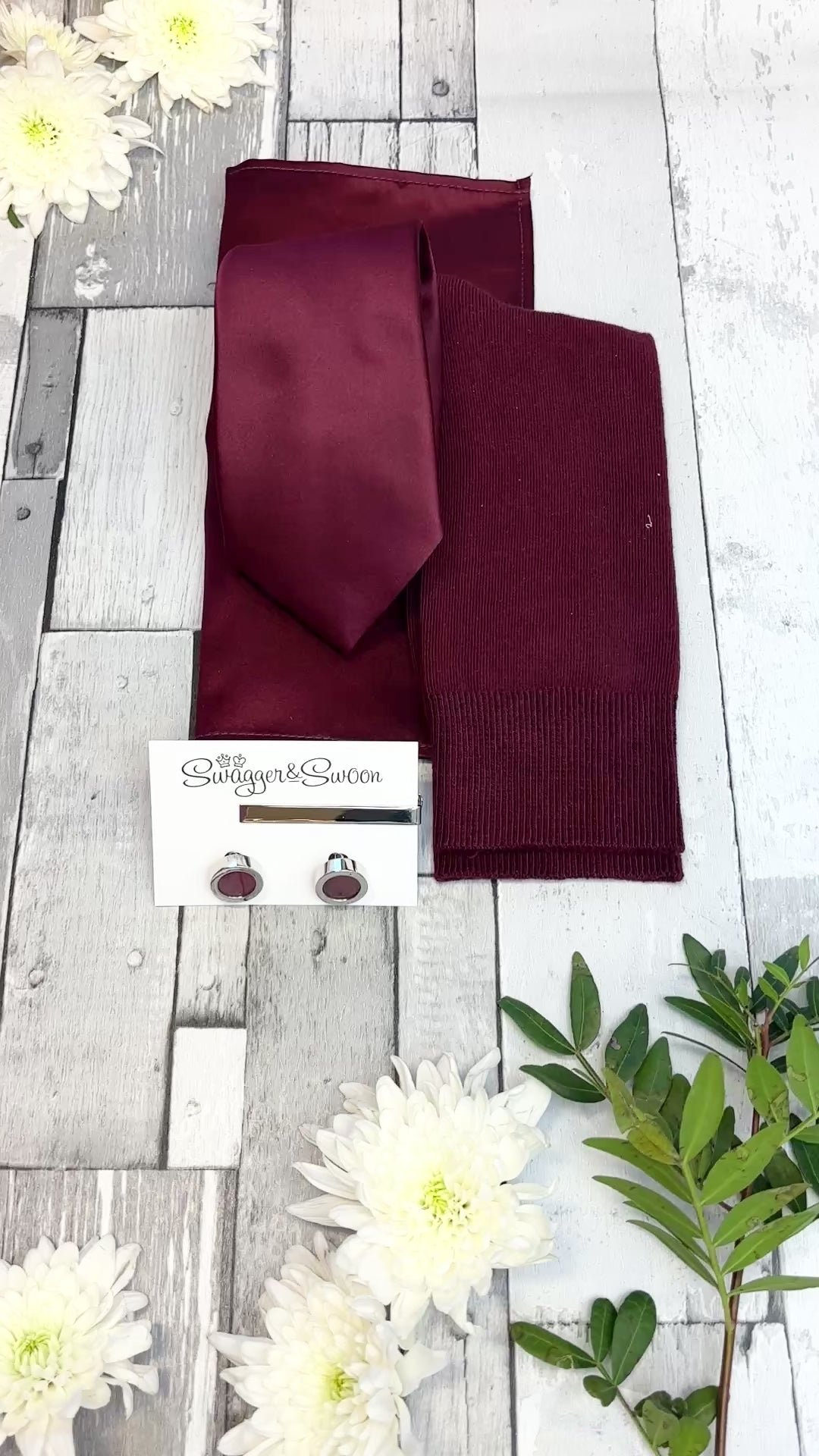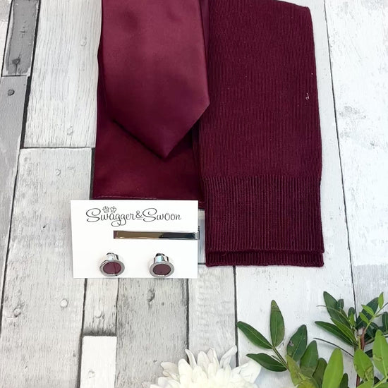 If you're looking for a perfectly curated gift set then look no further! This stunning white presentation box combines a Burgundy coloured wedding tie, matching pocket square and socks!