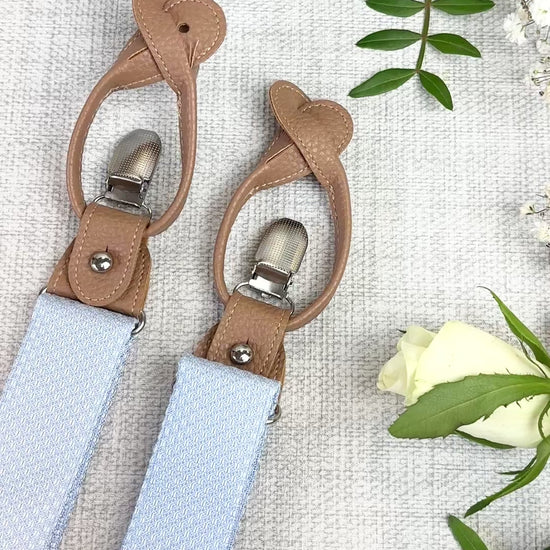 Refined, versatile, and designed for special occasions, our Cloudy Blue Woven convertible wedding braces bring a polished finish to your wedding attire. Crafted with a fabric panel to match the ties from centre-back to front waist and an elasticated back for comfort, they offer a subtle statement that complements wedding attire and smart tailoring alike.