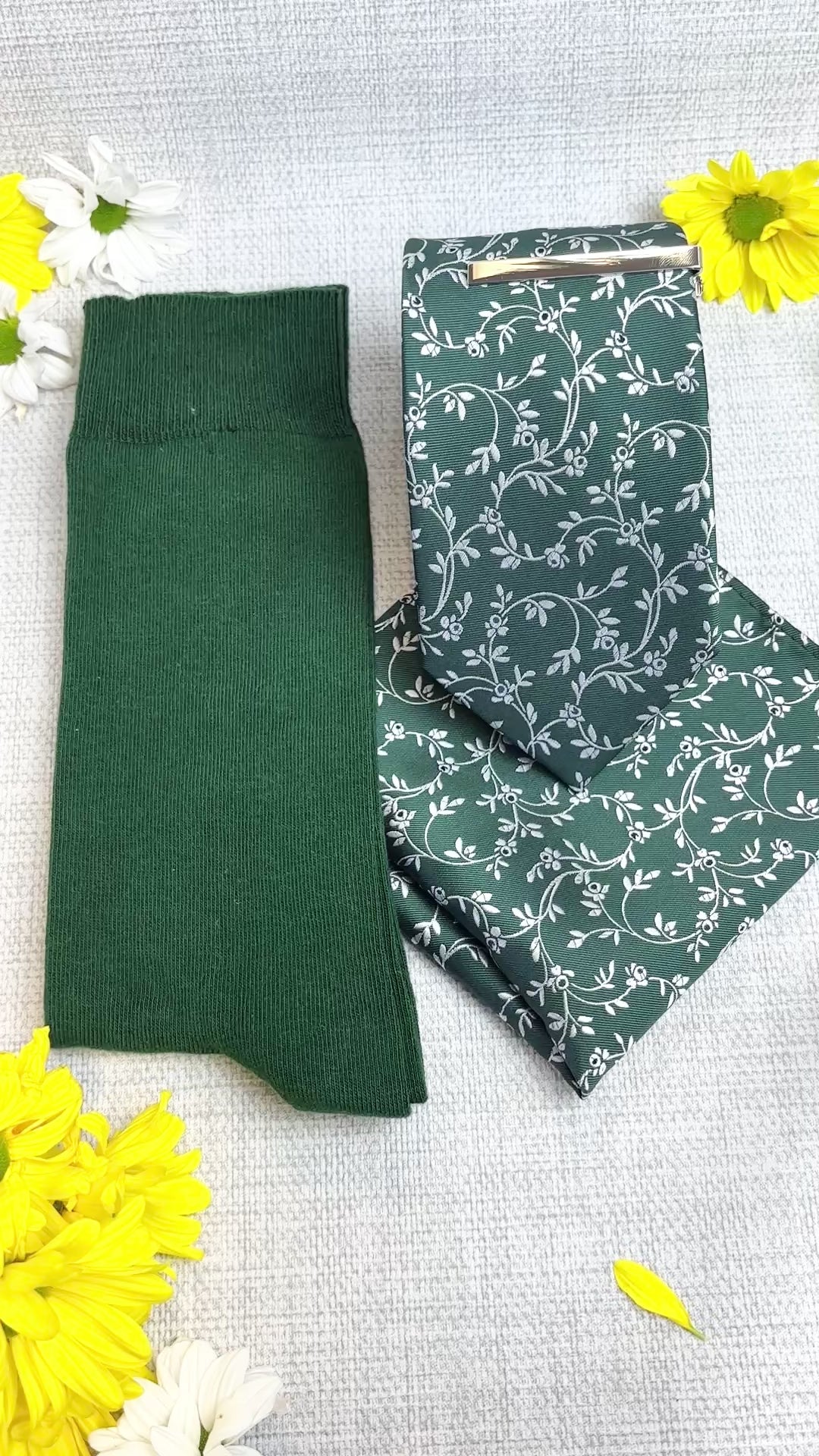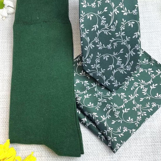 If you're looking for a perfectly curated gift set then look no further! This stunning white presentation box combines a Dark Green Leaves coloured wedding tie, matching pocket square and socks!