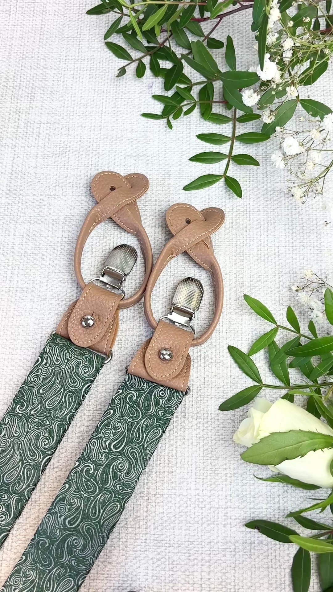 Refined, versatile, and designed for special occasions, our Dark Green Paisley convertible wedding braces bring a polished finish to your wedding attire. Crafted with a fabric panel to match the ties from centre-back to front waist and an elasticated back for comfort, they offer a subtle statement that complements wedding attire and smart tailoring alike.