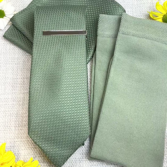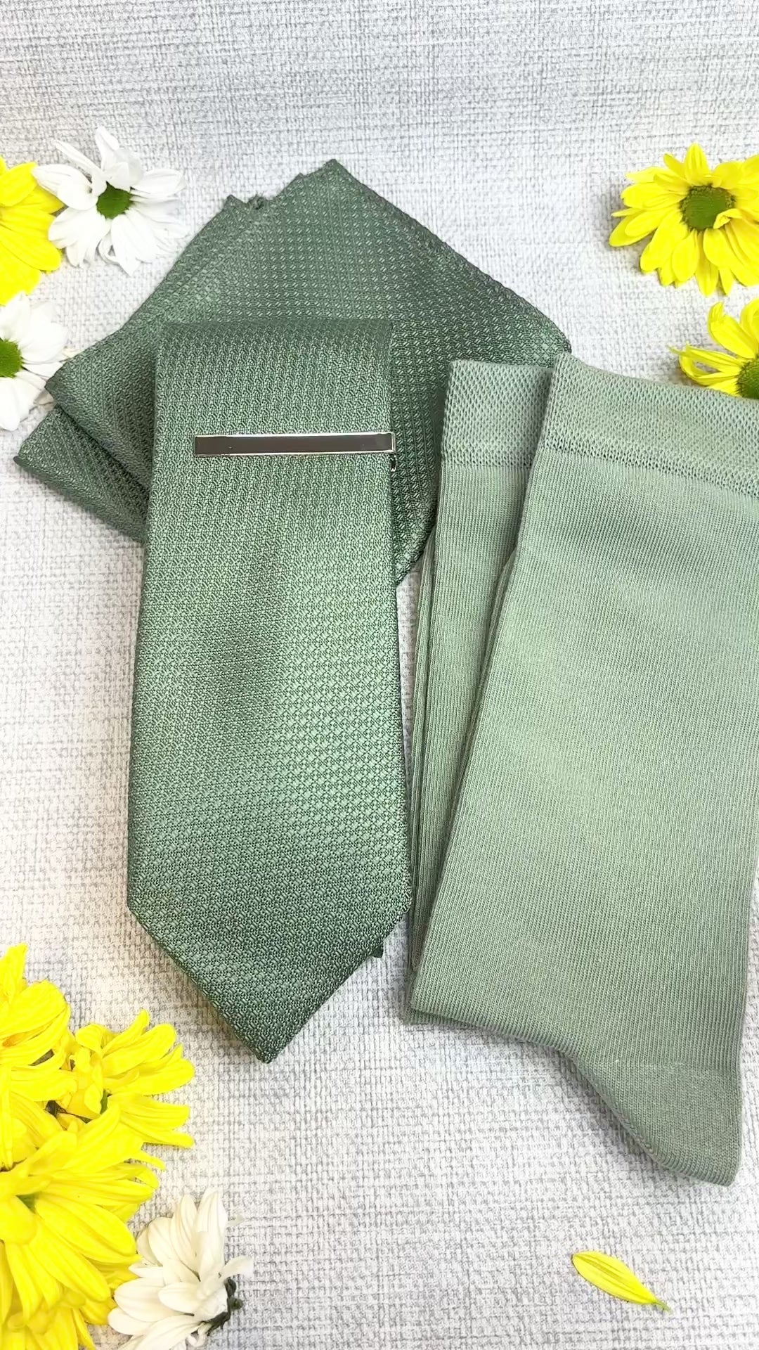If you're looking for a perfectly curated gift set then look no further! This stunning white presentation box combines a Dark Sage Woven coloured wedding tie, matching pocket square and socks!