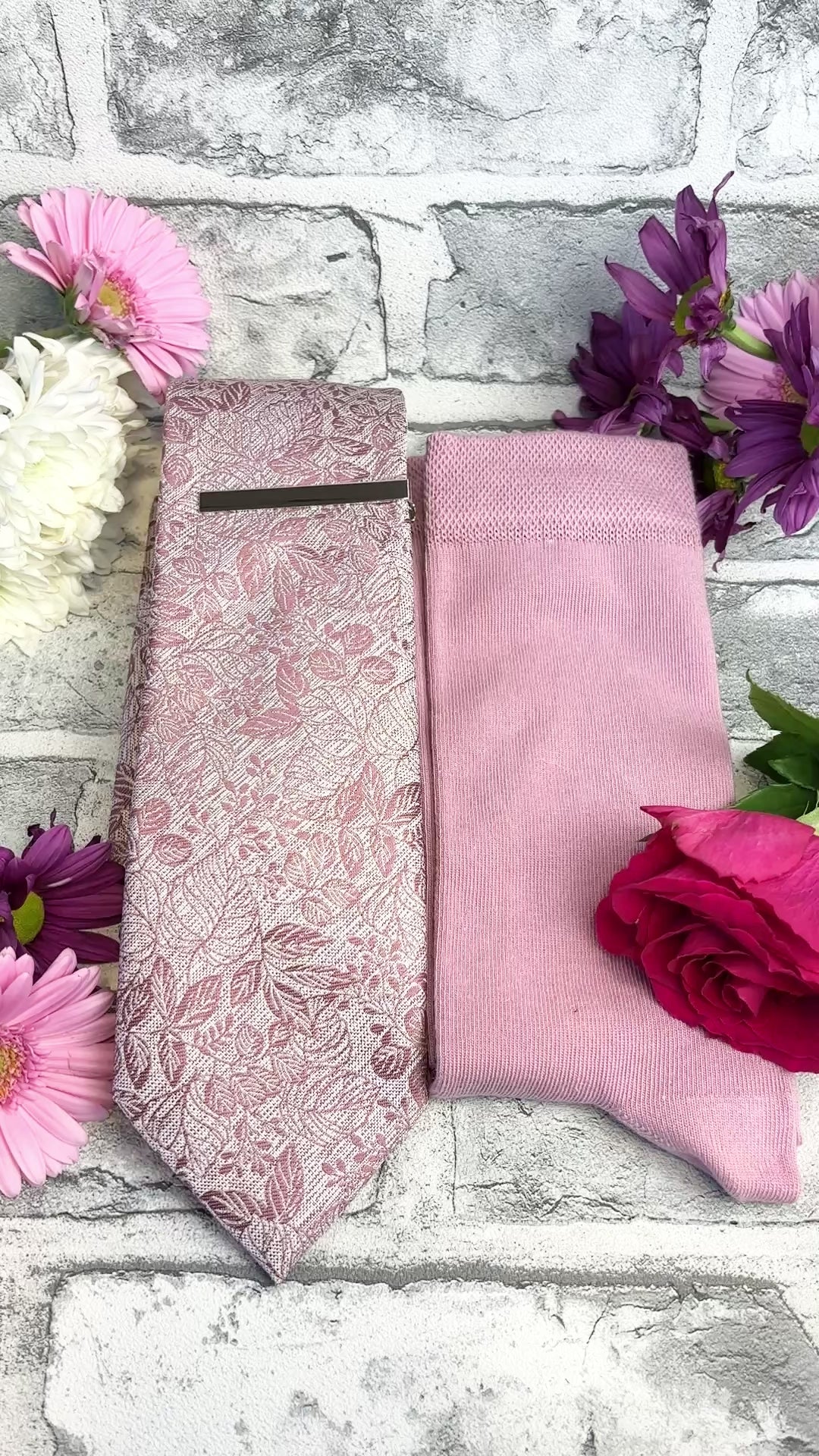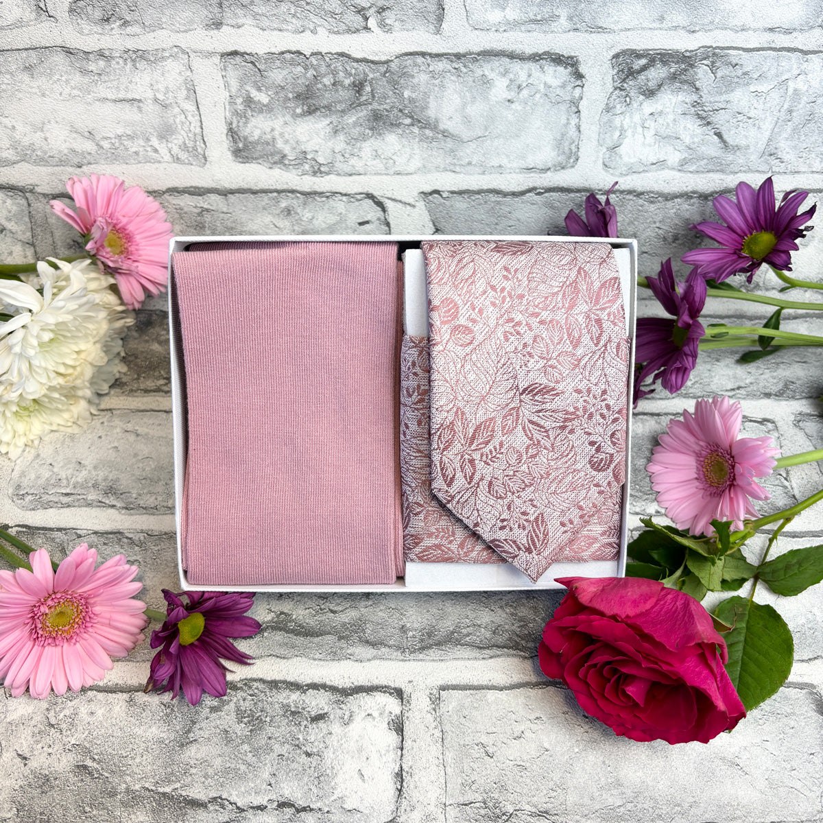 If you're looking for a perfectly curated gift set then look no further! This stunning white presentation box combines a Desert Rose Woodland Leaves coloured wedding tie, matching pocket square and socks!