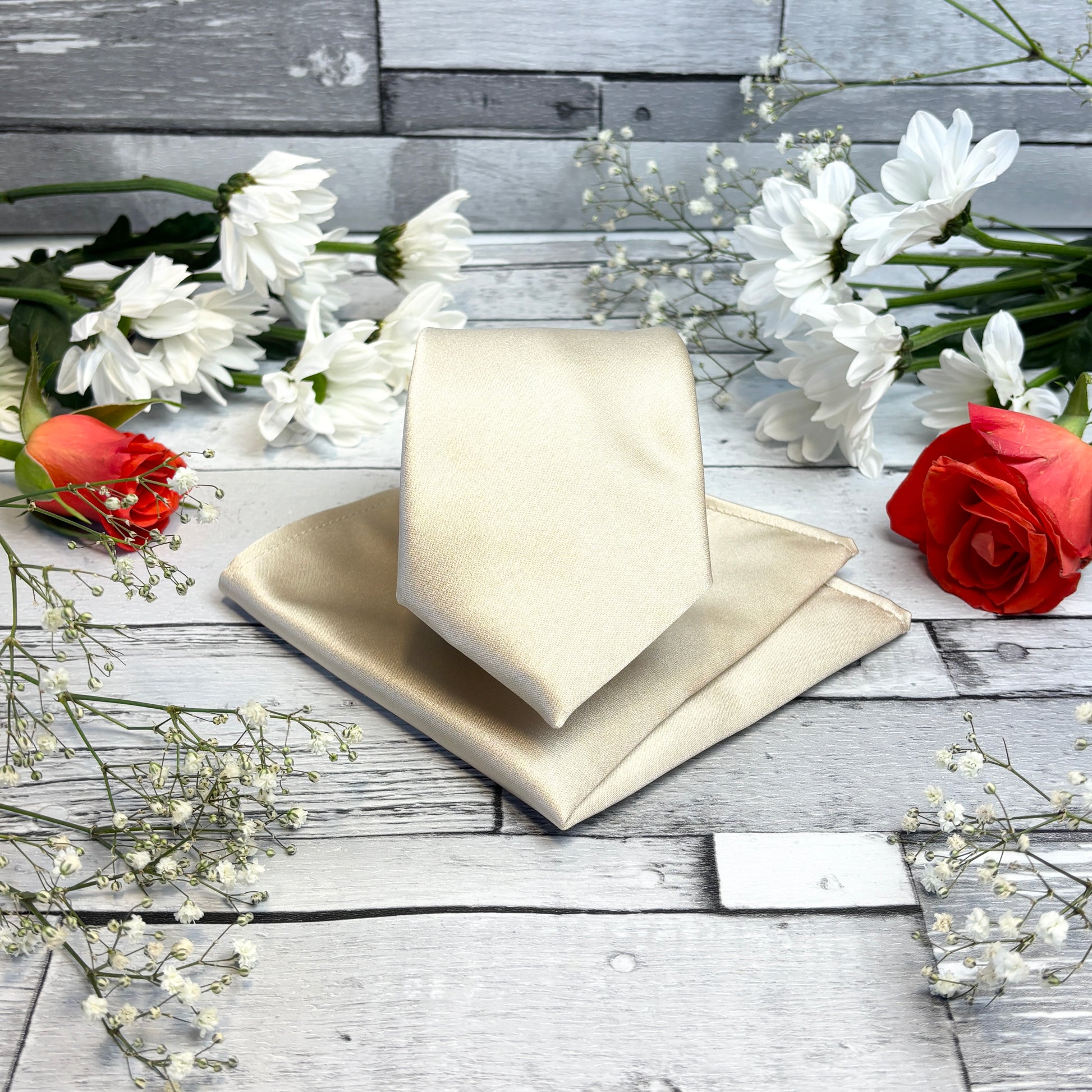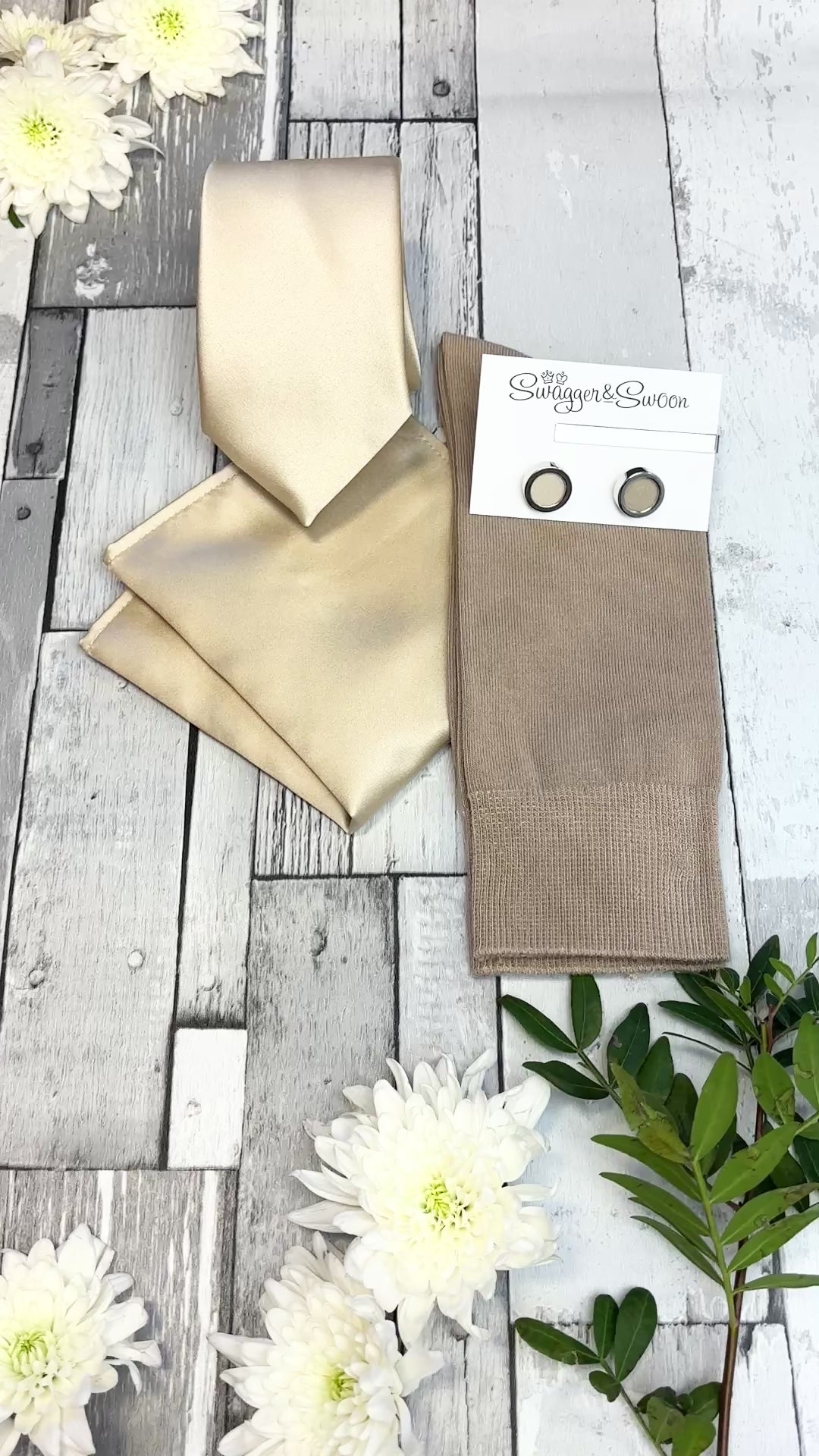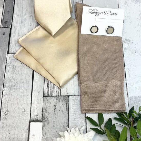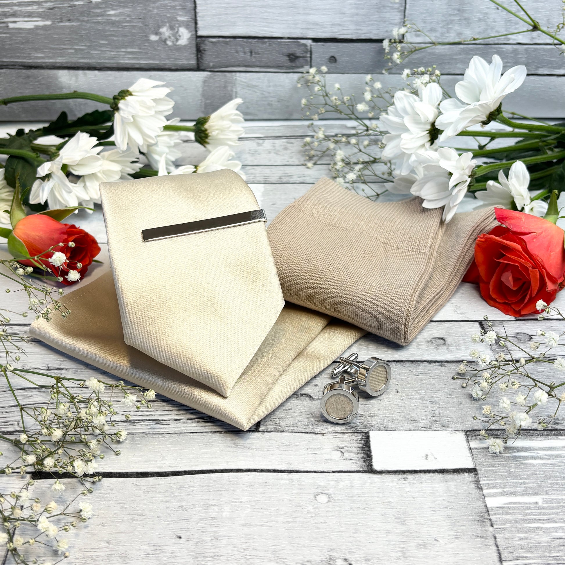 If you're looking for a perfectly curated gift set then look no further! This stunning white presentation box combines a Dune coloured wedding tie, matching pocket square and socks!
