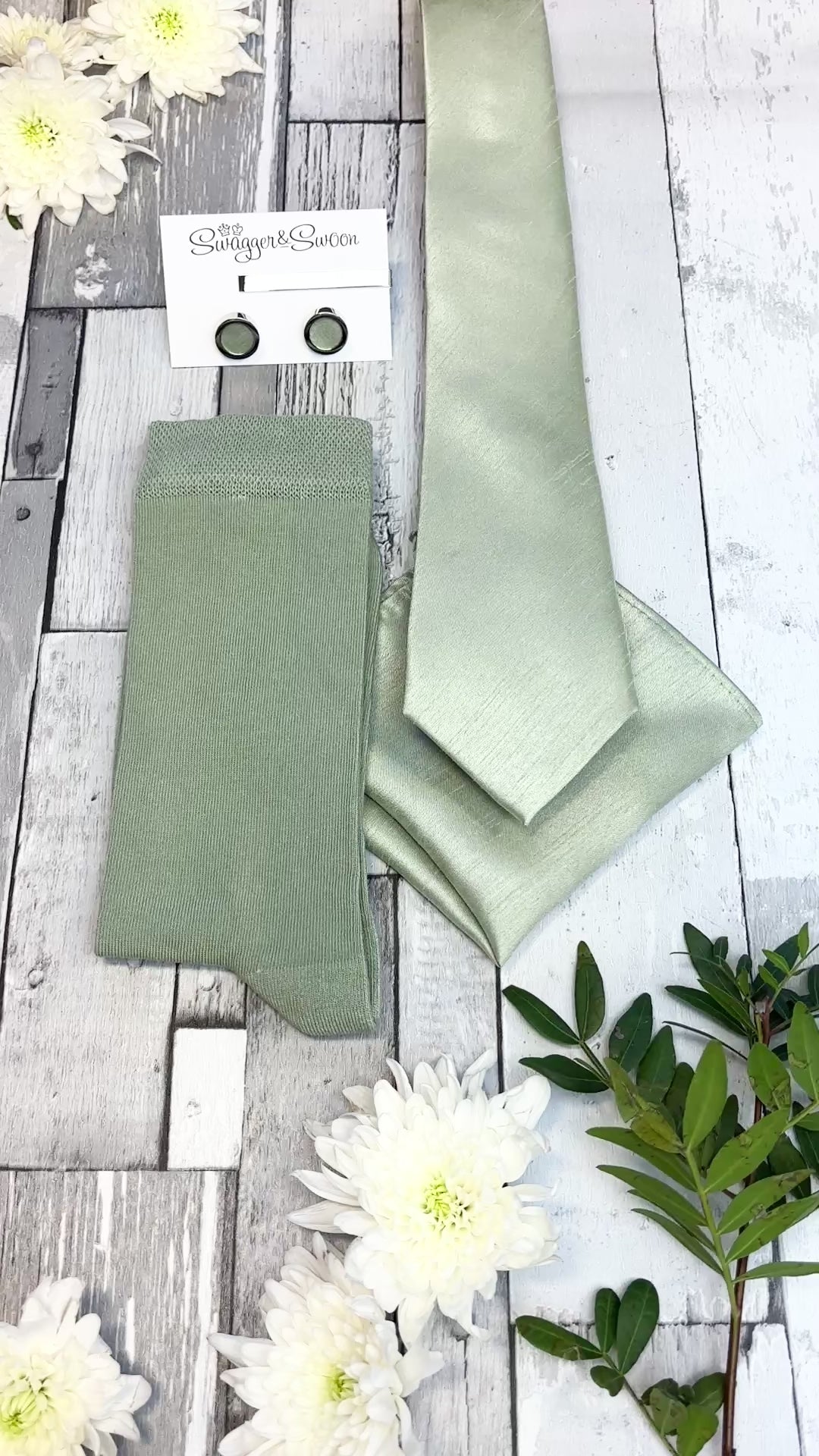 If you're looking for a perfectly curated gift set then look no further! This stunning white presentation box combines a Light Sage Shantung coloured wedding tie, matching pocket square and socks!