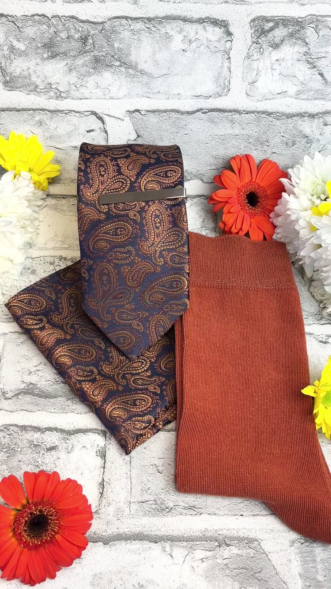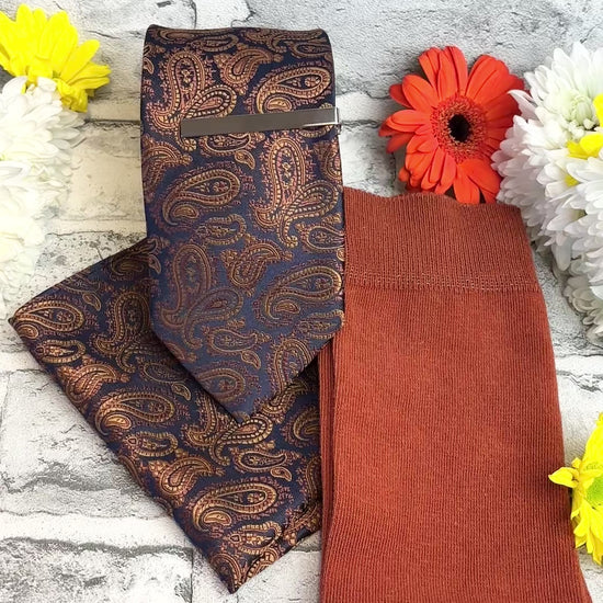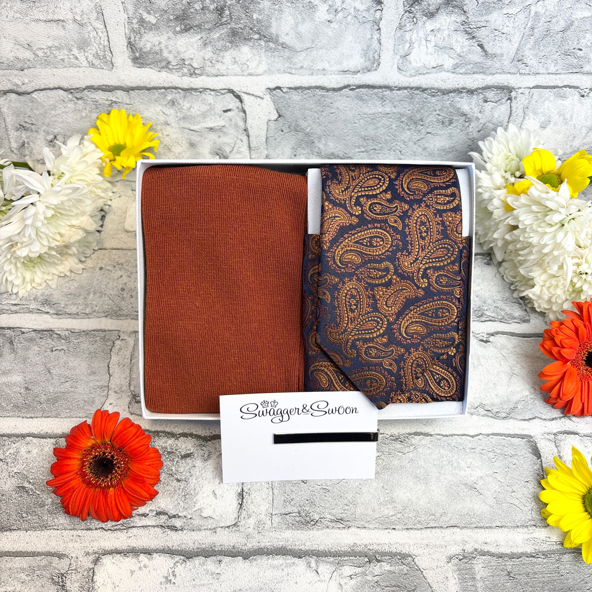 If you're looking for a perfectly curated gift set then look no further! This stunning white presentation box combines a Navy & Copper Paisley coloured wedding tie, matching pocket square and socks!