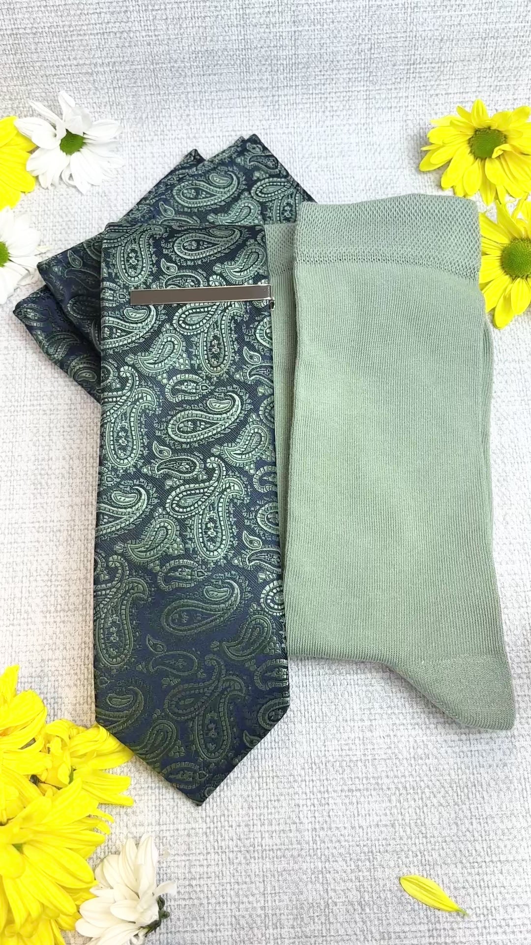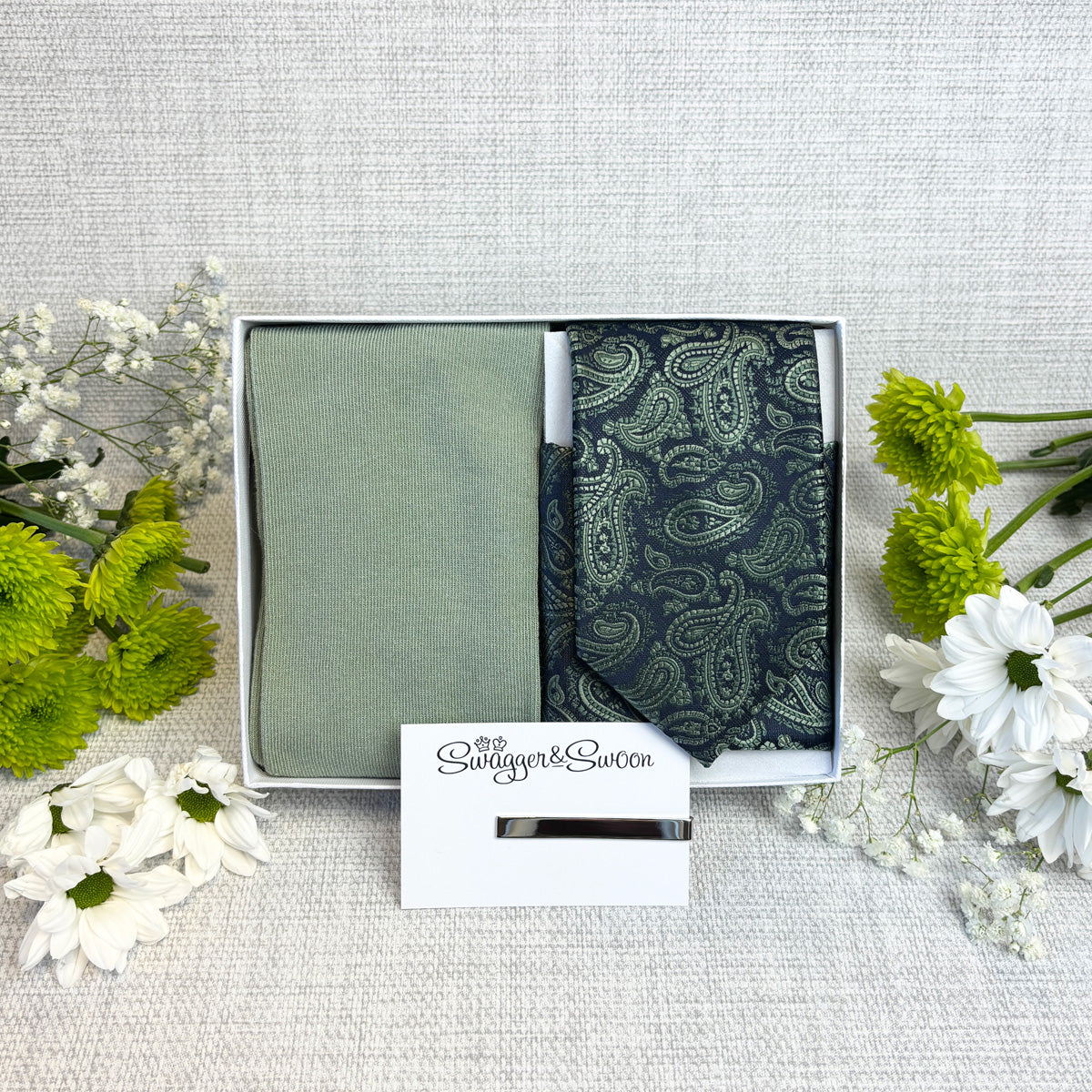 If you're looking for a perfectly curated gift set then look no further! This stunning white presentation box combines a Navy & Sage Paisley coloured wedding tie, matching pocket square and socks!