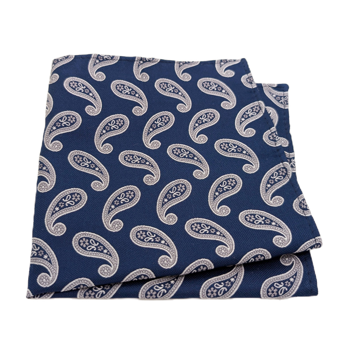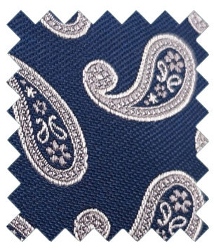 Fabric swatch for the Navy & Silver Paisley Silk wedding tie, for checking colour and fabric texture.