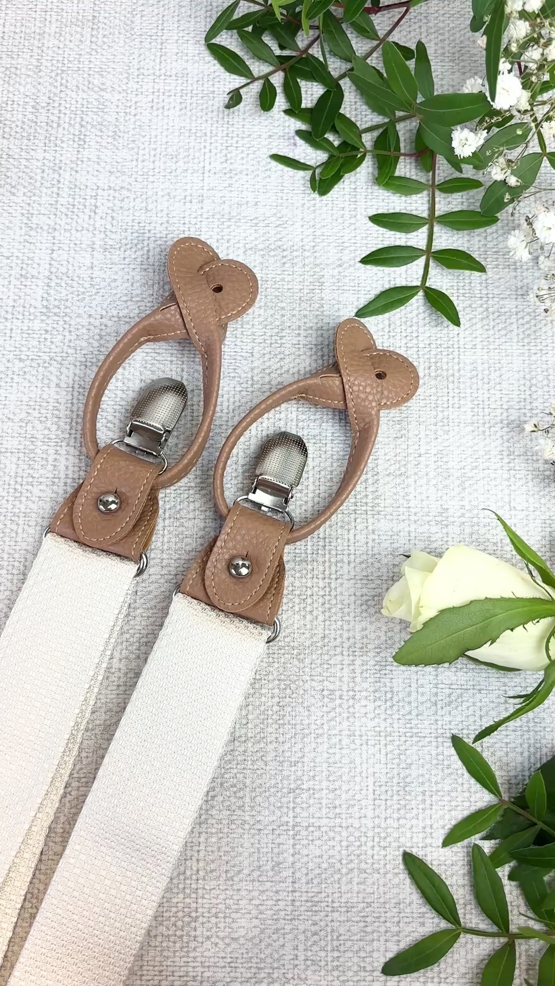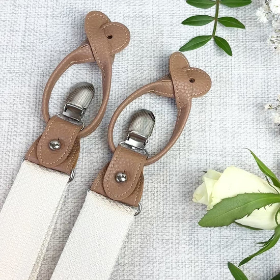 Refined, versatile, and designed for special occasions, our Neat Ivory Woven convertible wedding braces bring a polished finish to your wedding attire. Crafted with a fabric panel to match the ties from centre-back to front waist and an elasticated back for comfort, they offer a subtle statement that complements wedding attire and smart tailoring alike.