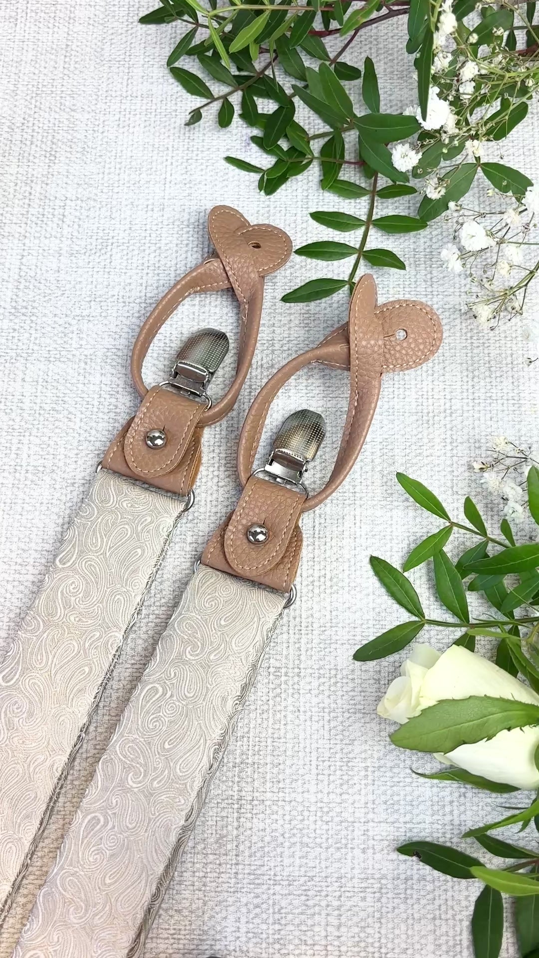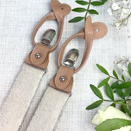 Refined, versatile, and designed for special occasions, our Oyster Paisley convertible wedding braces bring a polished finish to your wedding attire. Crafted with a fabric panel to match the ties from centre-back to front waist and an elasticated back for comfort, they offer a subtle statement that complements wedding attire and smart tailoring alike.