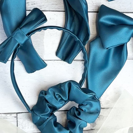 Our elegant Hunter Green hair accessories are the perfect way to match the groomsmen and complete the wedding party! Add a flash of colour to add to your hair with this pussy hair bow that has a handy barrette clip for ease of use.