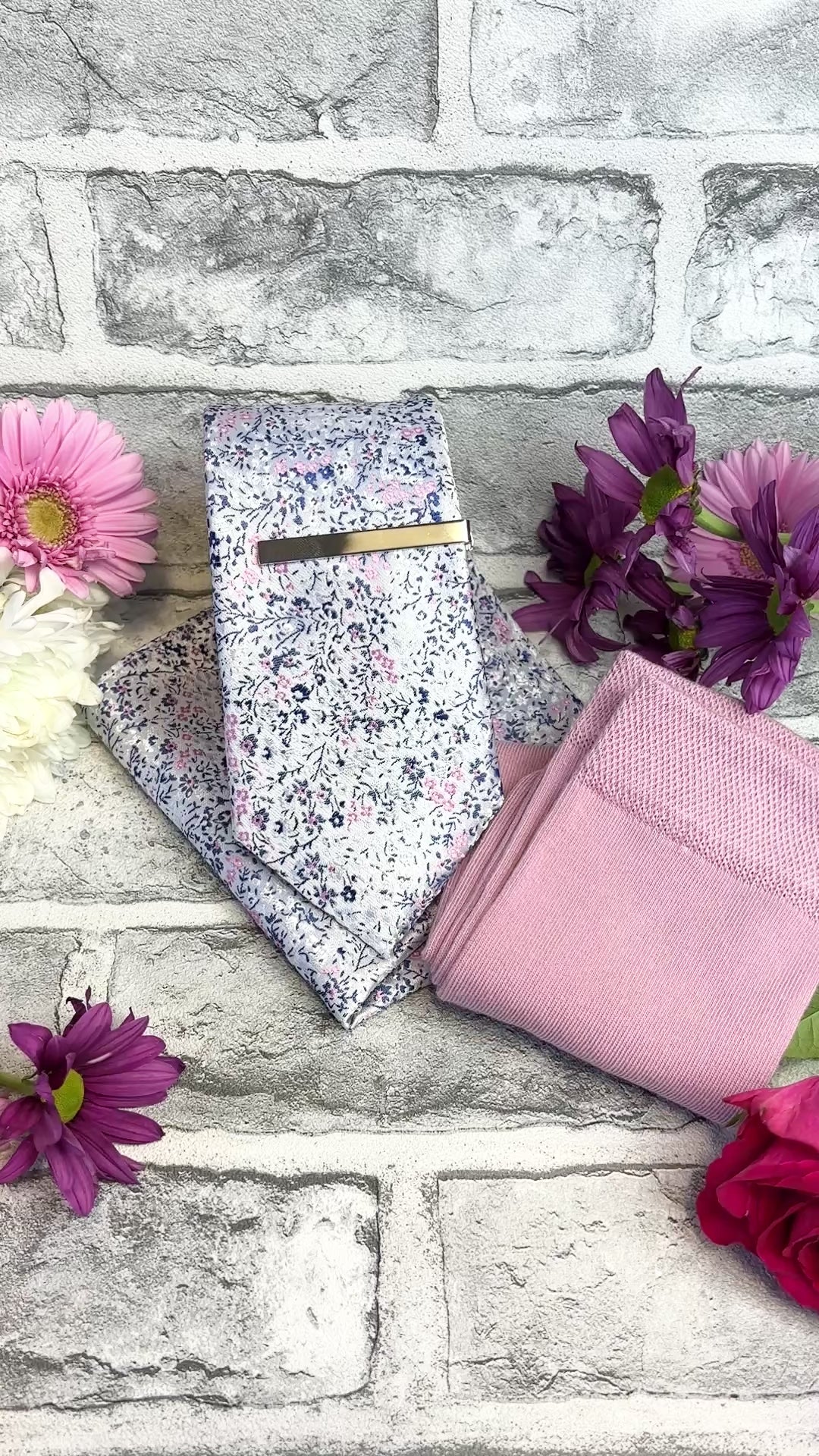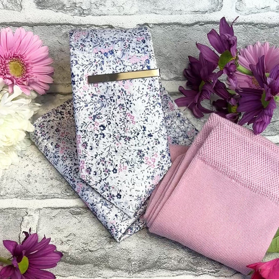 If you're looking for a perfectly curated gift set then look no further! This stunning white presentation box combines a Pink & Silver Ditsy Floral coloured wedding tie, matching pocket square and socks!