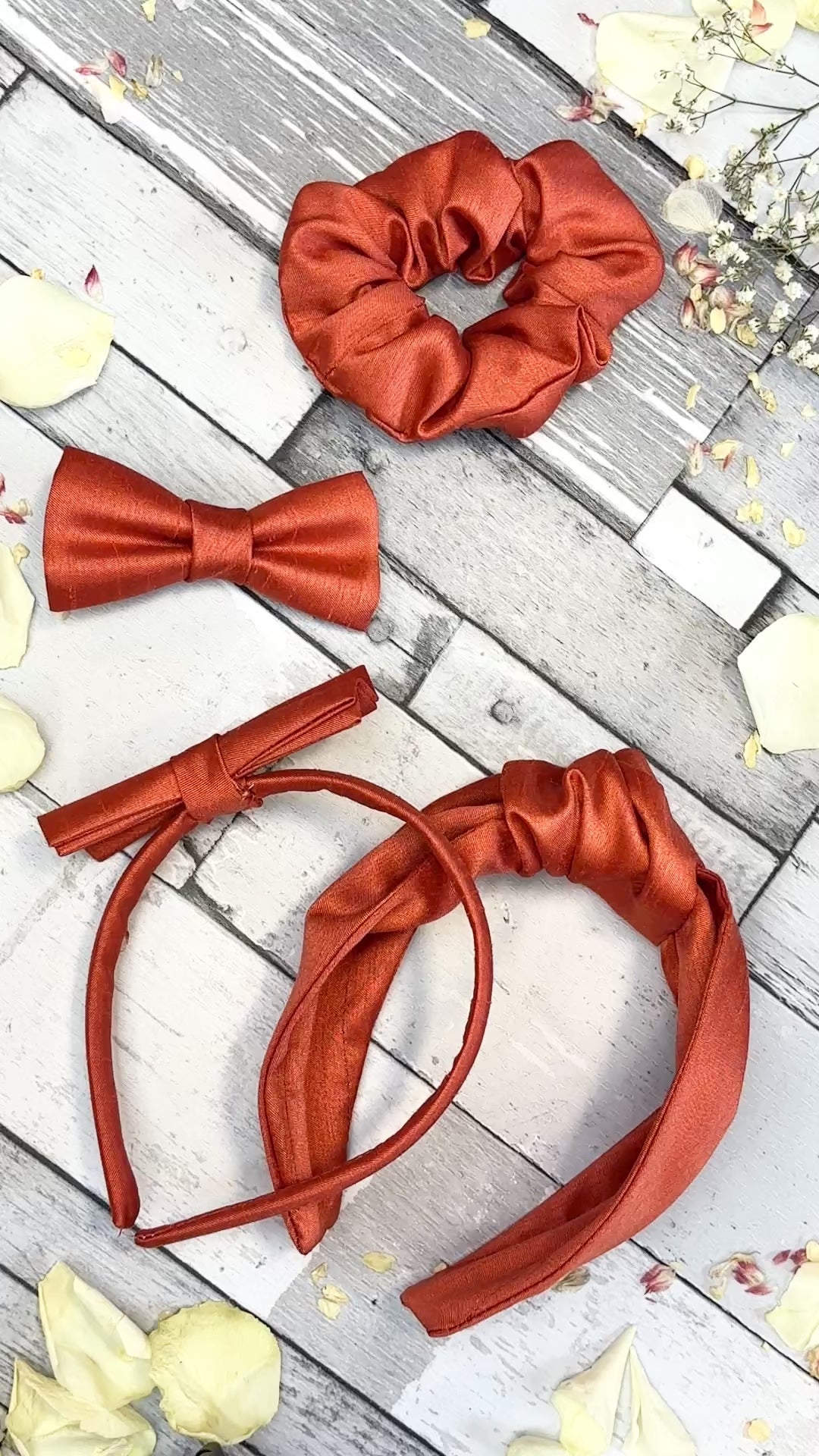 Our elegant Rust Shantung hair accessories are the perfect way to match the groomsmen and complete the wedding party! Add a flash of colour to add to your hair with this pussy hair bow that has a handy barrette clip for ease of use.