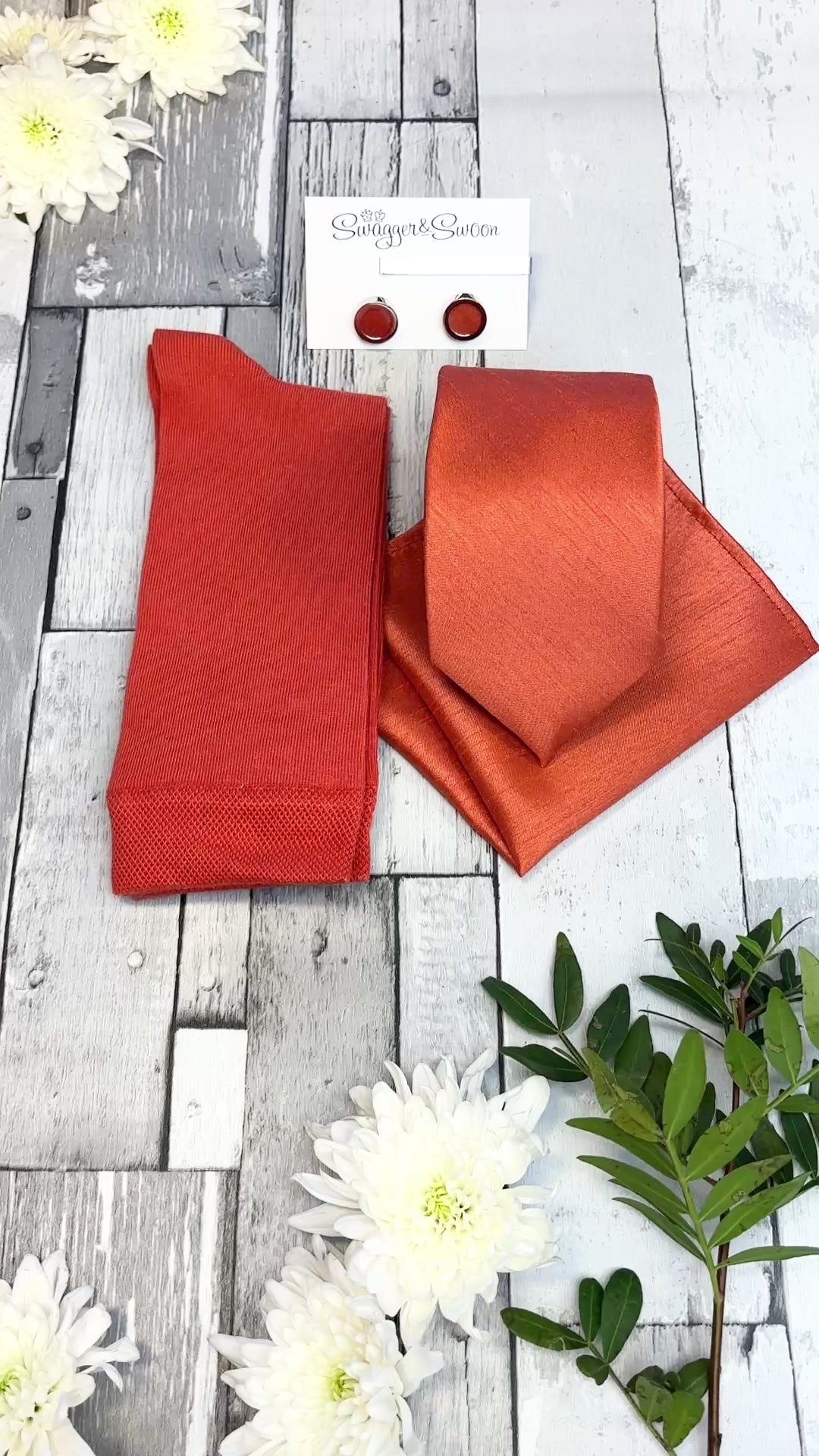 If you're looking for a perfectly curated gift set then look no further! This stunning white presentation box combines a Rust Shantung coloured wedding tie, matching pocket square and socks!