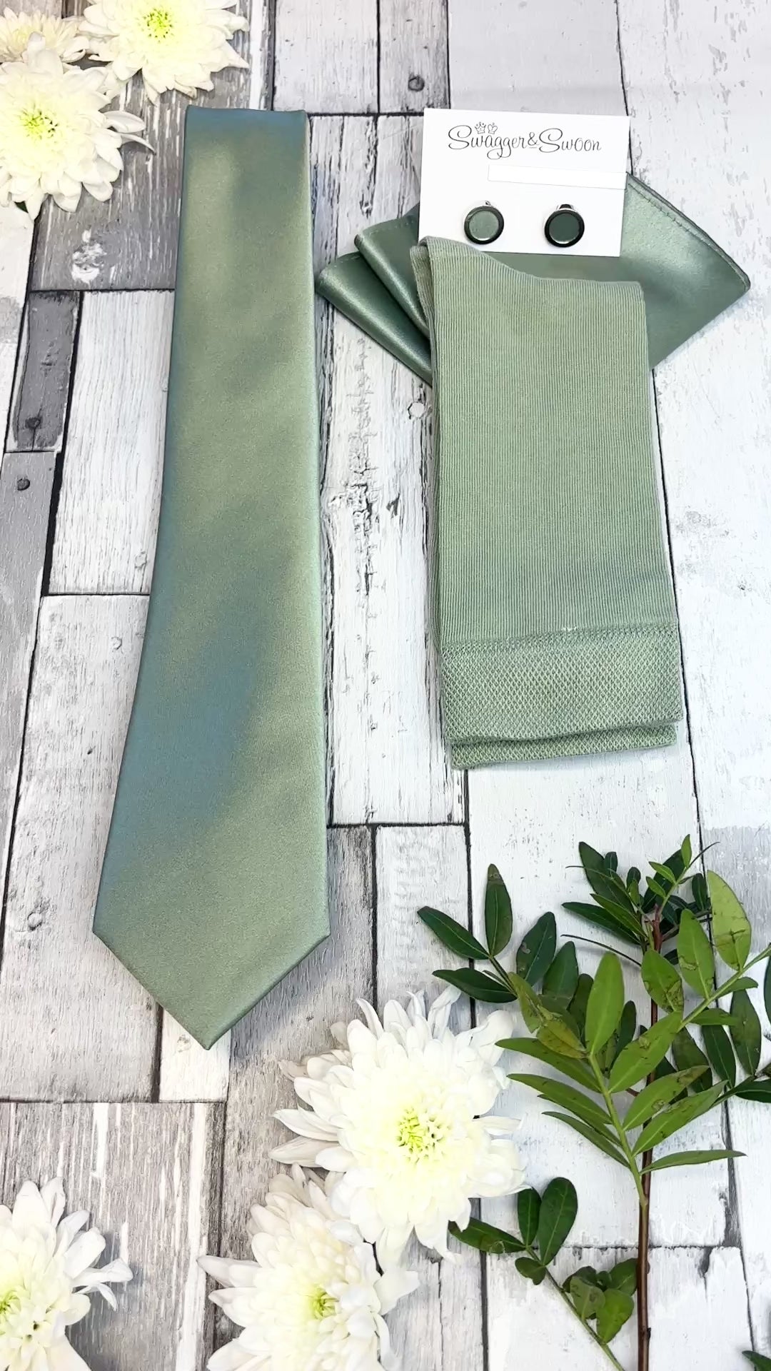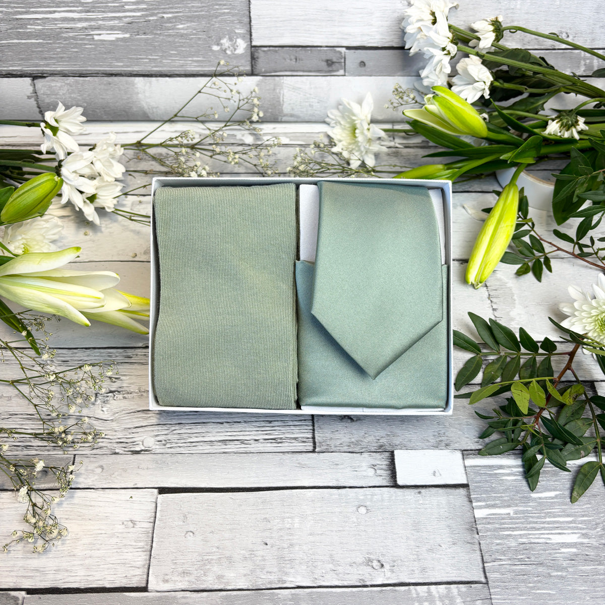 If you're looking for a perfectly curated gift set then look no further! This stunning white presentation box combines a Sage coloured wedding tie, matching pocket square and socks!