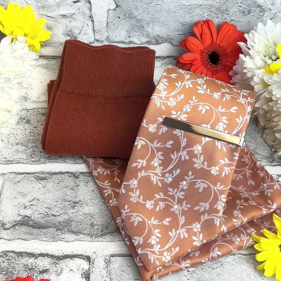 A patterned, Spice Leaves wedding pocket square, the perfect accessory to complement a matching tie or bow for the groom and groomsmen on your wedding day!