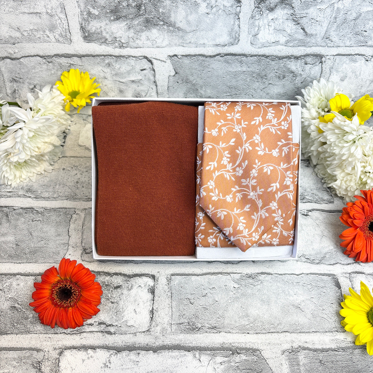 If you're looking for a perfectly curated gift set then look no further! This stunning white presentation box combines a Spice Leaves coloured wedding tie, matching pocket square and socks!