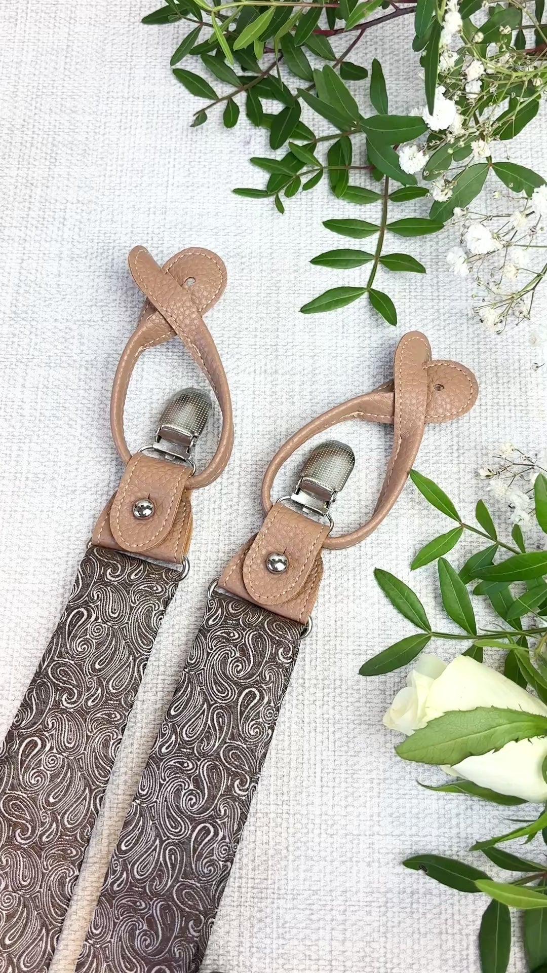 Refined, versatile, and designed for special occasions, our Walnut Paisley convertible wedding braces bring a polished finish to your wedding attire. Crafted with a fabric panel to match the ties from centre-back to front waist and an elasticated back for comfort, they offer a subtle statement that complements wedding attire and smart tailoring alike.