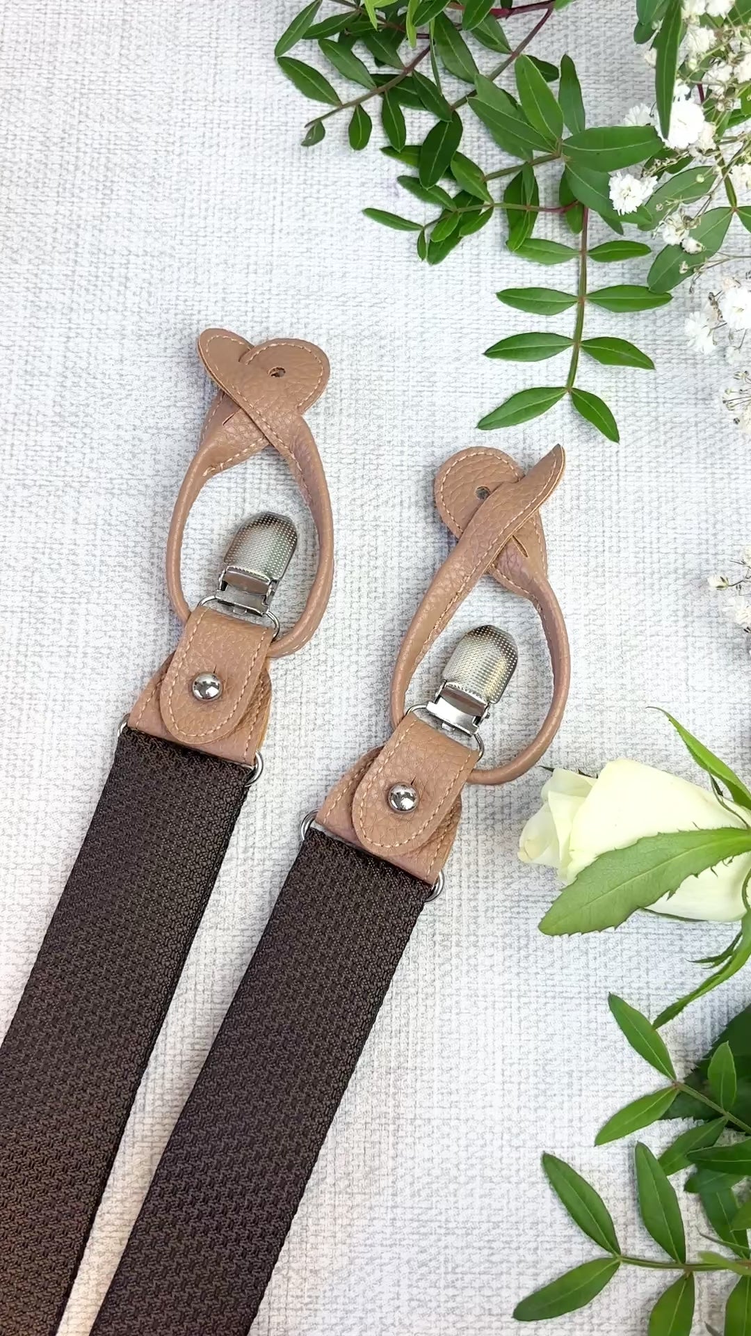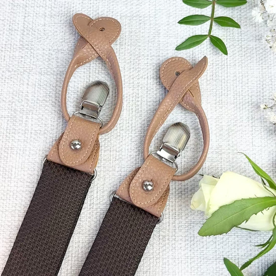 Refined, versatile, and designed for special occasions, our Walnut Woven convertible wedding braces bring a polished finish to your wedding attire. Crafted with a fabric panel to match the ties from centre-back to front waist and an elasticated back for comfort, they offer a subtle statement that complements wedding attire and smart tailoring alike.