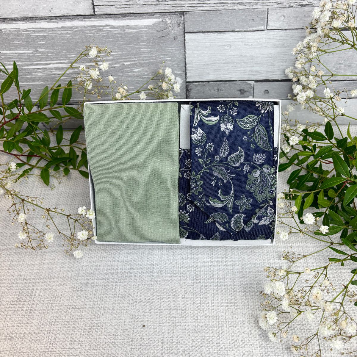 If you're looking for a perfectly curated gift set then look no further! This stunning white presentation box combines a Wild Sage Baroque Damask coloured wedding tie, matching pocket square and socks!