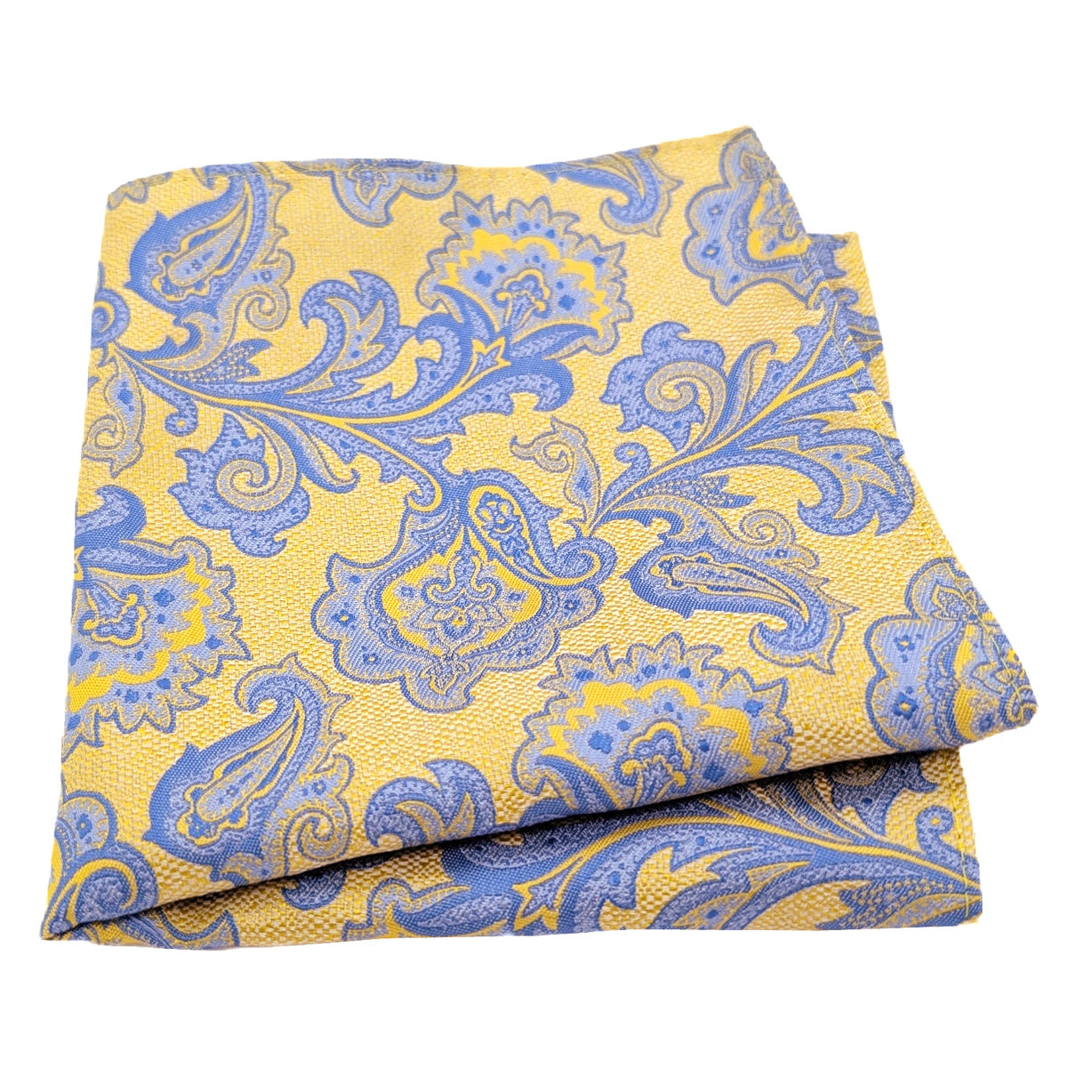 A patterned, Yellow Fancy Paisley pocket square, the perfect accessory for the groom and groomsmen on your wedding day!